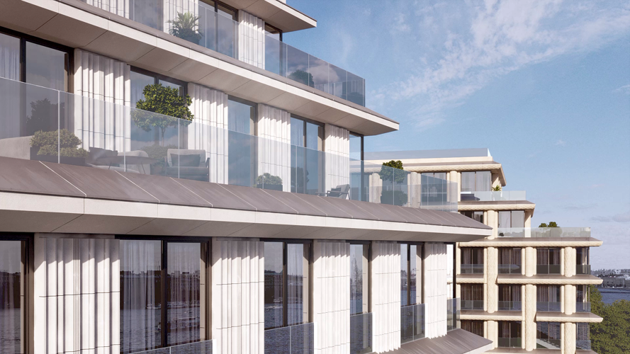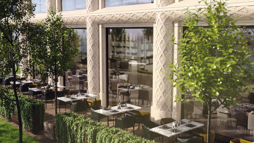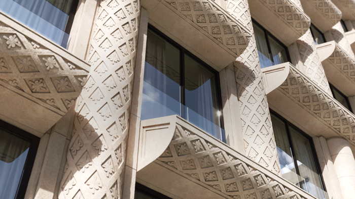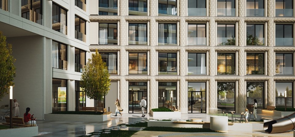 Фасады из светлого камня с резьбой, вдохновленной песками Комарово. Сложная геометрия и фактура с мраморной крошкой идеально вписаны в исторический контекст, создавая новую классику Петербурга.