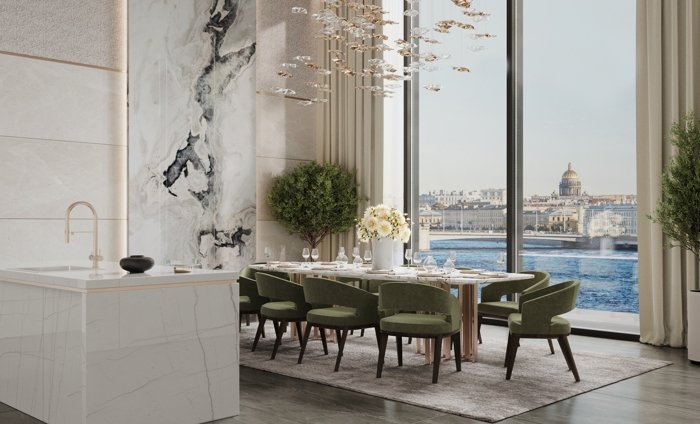 Уникальное расположение дома на узком перешейке дарит панорамные виды на две акватории. Наслаждайтесь бесконечным горизонтом Малой Невы или спокойной гладью Петровского пруда из любой резиденции.