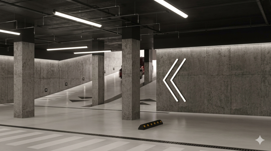 Подземный паркинг с зарядками для электромобилей и кладовыми для хранения вещей. Всего 470 машино-мест (больше, чем квартир) и 180 кладовых площадью от 3,7 до 10,4 м².