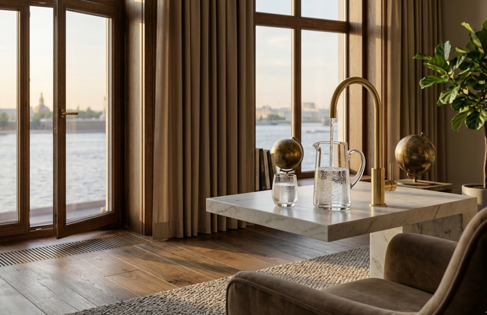 Умная система проветривания постоянно обновляет воздух в квартире без сквозняков и пыли, сохраняя тепло. Из крана течет вода питьевого качества, а для кондиционера уже все готово — внешний блок ставится на крышу, так что вам не нужно портить фасад или тратиться на сложные согласования.
