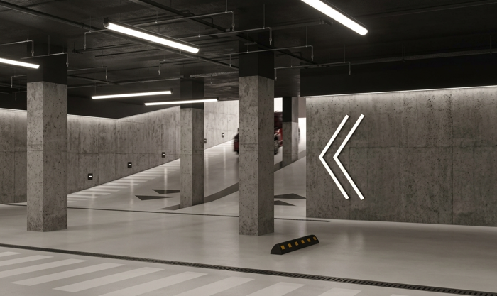 Паркинг с доступом на лифте гарантирует комфорт и безопасность автомобиля в любую погоду. Пространство оборудовано 10 зарядками для электрокаров и усилением связи.